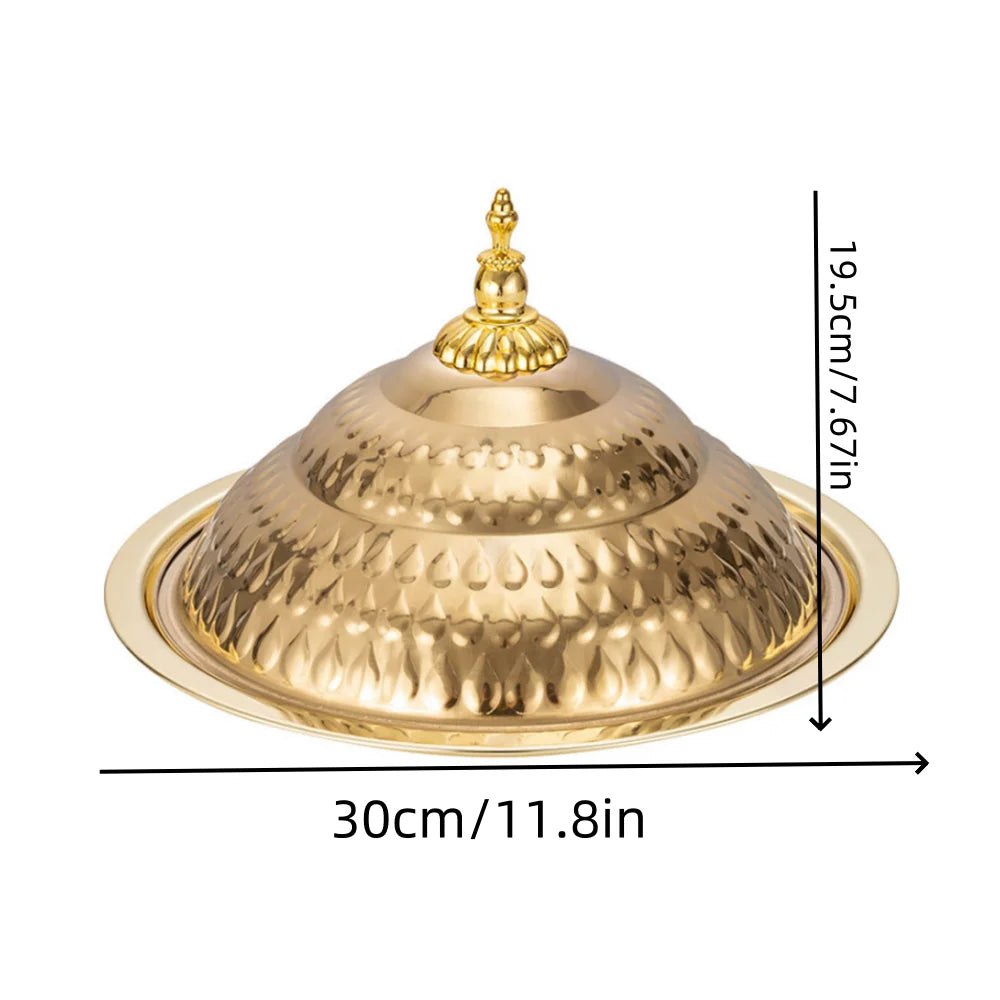 Elegante Servierplatte aus hochwertigem Edelstahl im retro-europäischen Design. Diese runde Platte mit dekorativem Deckel eignet sich perfekt zum Servieren von Obst, Desserts und Snacks. Der wassertropfenförmige Deckel schützt Ihre Speisen und verleiht Ihrem Tisch einen Hauch von Eleganz. Ideal für besondere Anlässe, Partys oder den täglichen Gebrauch.